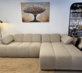 De elementenbank is uitgevoerd in vier kleurlijnen in de stofopties bouclé en geweven ribstof.