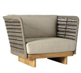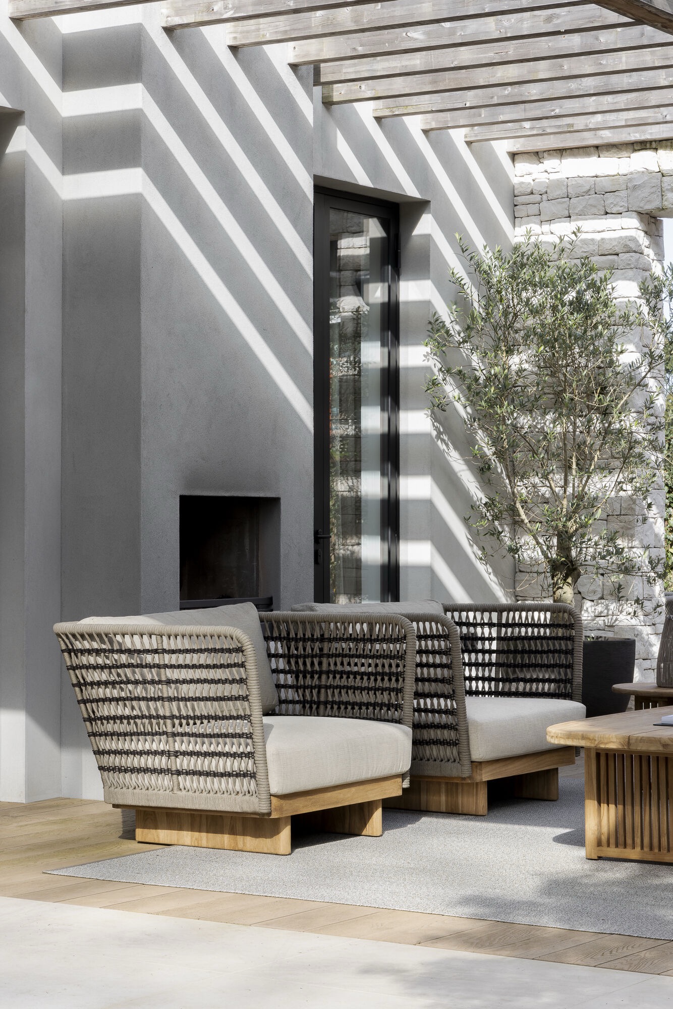 Het opvallende teakhouten frame heeft een uniek design met doorlopende sledepoten, wat zowel stabiliteit als een eigentijdse uitstraling biedt. De zitting en rugleuning zijn vervaardigd uit verfijnd rope in warme aardetinten, waarbij stevige Camel-draden worden verbonden door subtiele Espresso-rope. Deze ambachtelijke weeftechniek geeft de fauteuil een exclusief karakter. Met zijn royale formaat en coconachtige leuningen biedt de Fiore Fauteuil ultiem zitcomfort.