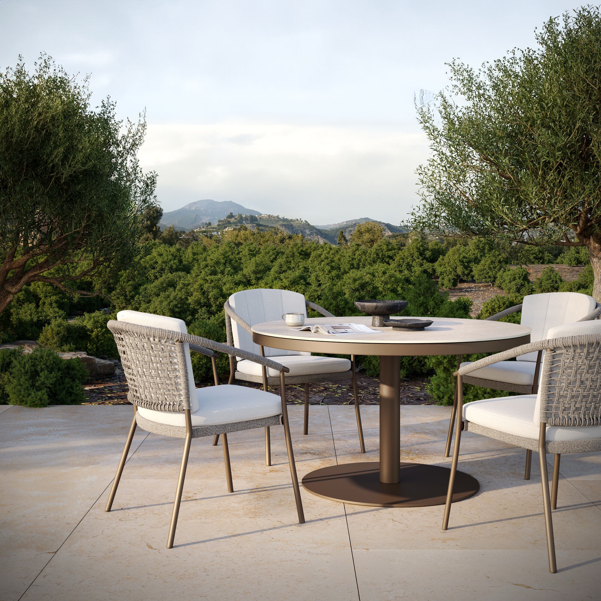 Het bronskleurige aluminium frame en dubbel geweven wengé rope geven de stoel een luxe uitstraling. De elegante, gebogen rugleuning voegt comfort toe en creëert een luchtig, licht design. Dankzij het stapelbare ontwerp is de stoel niet alleen chic, maar ook praktisch in gebruik. Ideaal voor wie verfijning en gebruiksgemak zoekt in buitenmeubilair.
