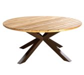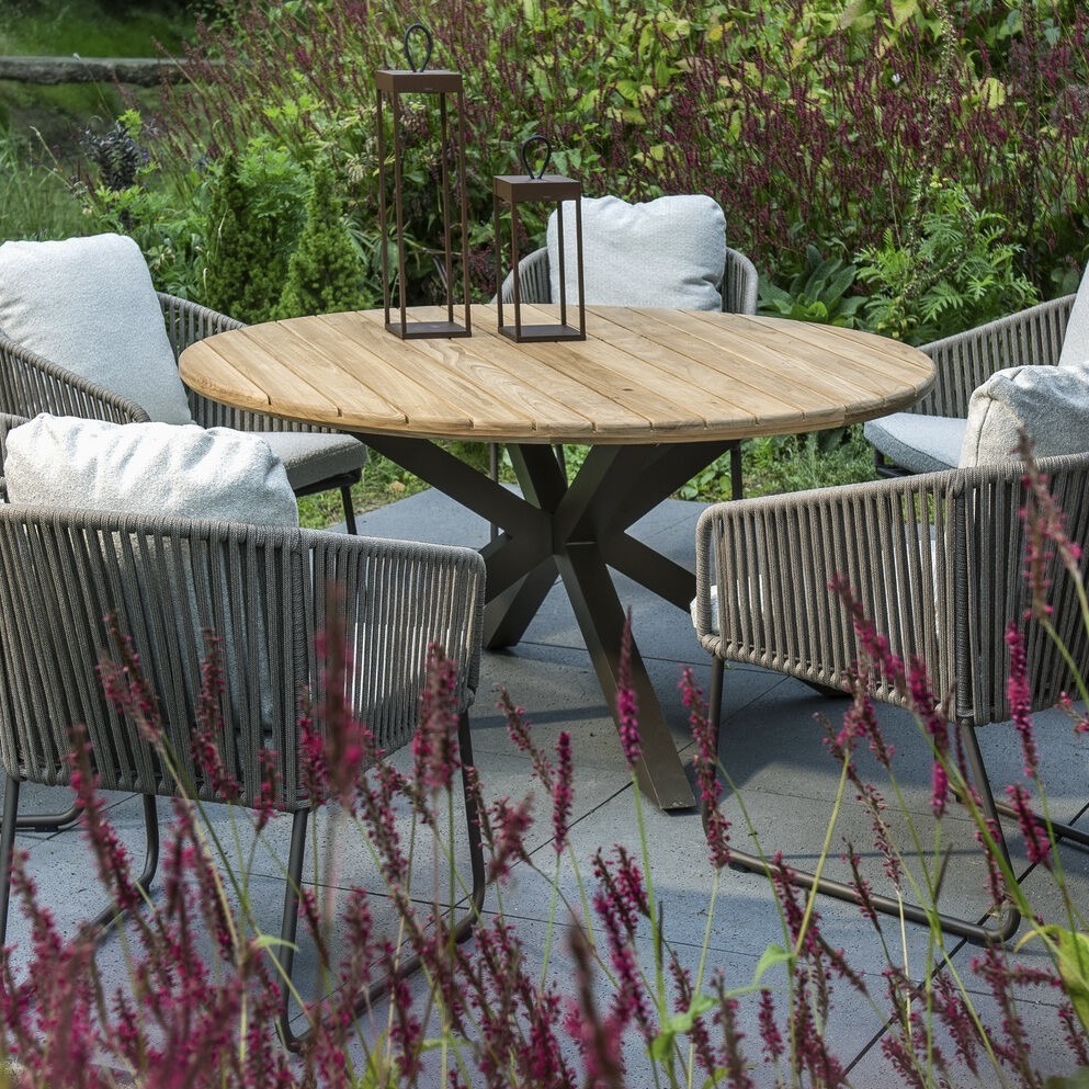Deze fantastische tafel heeft een blad van gecertificeerd teakhout met planken die tot aan de rand doorlopen en vakkundig zijn afgewerkt. Het blad steunt op een karakteristieke ‘spin’poot van aluminium in de kleur Salix of Bronze. Aan de ronde tafels met een diameter van 150 centimeter, kun je zeker met vier personen tafelen.