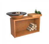 Het bestaat uit een OFYR kooktoestel met houtopslag, een stevig werkblad en een praktische houder voor keukengerei en kruiden. Verkrijgbaar in de diameters 85 cm en 100 cm. Het werkblad is verkrijgbaar in teakhout en donkergrijs keramiek.
