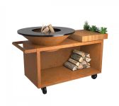 Het bestaat uit een OFYR kooktoestel met houtopslag, een stevig werkblad en een praktische houder voor keukengerei en kruiden. Verkrijgbaar in diameter 100 cm. Het werkblad is verkrijgbaar in teakhout en donkergrijs keramiek.
